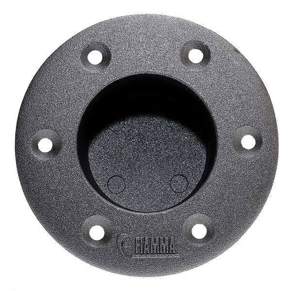 A chrome recessed base with table leg connections made of aluminium, the recessed connection is flush to the floor when fitted into a drilled hollow.